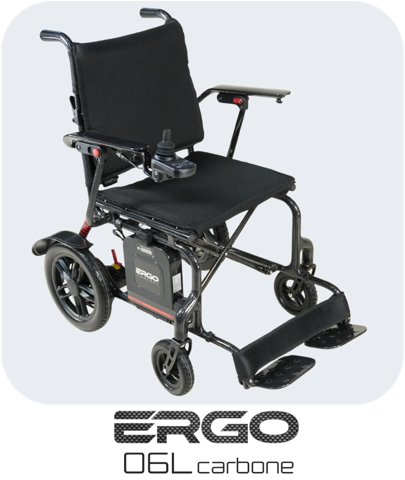 L’Ergo 06L Carbone combine la légèreté d’un châssis en fibre de carbone avec la praticité d’un pliage éclair. De votre salon au coffre de votre citadine, ce fauteuil roulant électrique pliable et ultra-léger vous accompagne partout… sans vous alourdir.