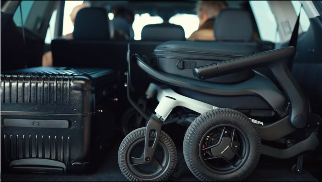Le fauteuil propose un grand espace de rangement grâce à une sacoche arrière détachable et un panier sous le siège. Plusieurs accessoires viennent compléter son équipement : support smartphone, porte-gobelet, sac de transport et compatibilité avec les grues de coffre Atlas, qui facilitent le chargement du fauteuil sans modification du véhicule.